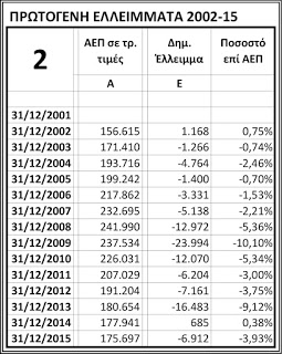 Βέβαια, κάποιος «έξυπνος» ημιμαθής, θα σπεύσει να μας πει ότι ο πίνακας αυτός δεν λέει όλη την αλήθεια. Διότι όλο αυτό το διάστημα από την ένταξή μας στην ΟΝΕ μέχρι σήμερα, δεν είχαμε «χρηστή» διοίκηση. Είχαμε ταυτόχρονα με την υποχρέωση για αποπληρωμή του παλιού χρέους, πρωτογενή ελλείμματα, τα οποία -για να τα καλύπτουμε- οι κυβερνήσεις αναγκάζονταν να προχωρούν επίσης σε επιπρόσθετο δανεισμό, που επιβάρυνε το αρχικό χρέος. Αυτό είναι εν μέρει αλήθεια και υπήρξε όντως μια σωρευτική επιβάρυνση του χρέους σε νέους τόκους και χρεολύσια. Ωστόσο όπως παρατηρούμε στον ακόλουθο πίνακα 2, τα ελλείμματα αυτά (στήλη Ε) σε σχέση με το ΑΕΠ δεν ήσαν ιδιαίτερα σημαντικά εκτός των ετών 2008-2010 και το 2013. Υπήρξαν μάλιστα δύο πλεονασματικά έτη. Ενώ, μέρος αυτών των ελλειμμάτων καλύπτονταν από τον εσωτερικό βραχυχρόνιο δανεισμό (πχ έντοκα γραμμάτια κτλ), που δεν επιβάρυναν το δημόσιο χρέος. Εντύπωση προκαλεί όμως η εκτίναξη του ελλείμματος το 2009, χωρίς αποχρώντα λόγο από την εξέλιξη των υπόλοιπων δημοσιονομικών μεγεθών, που επιτείνουν τις υπόνοιες, ότι υπήρξε μεθόδευση, προκειμένου να εισαχθεί η χώρα το 2010 στο καθεστώς της κατοχής μέσω των μνημονίων.