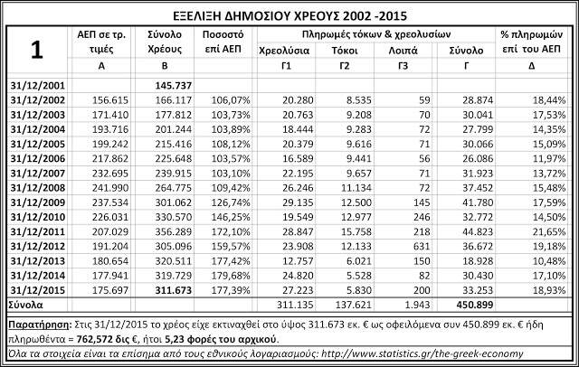 Γιατί όμως συμβαίνουν όλα αυτά; Ο πίνακας είναι αποκαλυπτικός. Μέχρι το 2015 είχαμε πληρώσει ούτε λίγο ούτε πολύ 450.889 εκ. ευρώ (στήλη Γ) σε τόκους και χρεολύσια και το χρέος είχε διαμορφωθεί, παρά τα σκληρά μέτρα, το PSI, τις «μεταρρυθμίσεις», τη φτώχεια και τη δυστυχία του ελληνικού λαού στα (στήλη Β) 311.673 εκ. ευρώ, μεγαλύτερο εκείνου, πριν μπούμε στα μνημόνια. Σύνολο χρέους -πληρωμένο και υπολειπόμενο- 762.572 εκ. ευρώ. Εκπλήσσεται κάποιος, όταν αντικρύζει τους αριθμούς και το ότι ήδη είχαμε πληρώσει στις 31/12/2015 με ιδρώτα και αίμα κυριολεκτικά 450.899 εκ. ευρώ, δηλαδή περισσότερο από τρεις φορές το αρχικό χρέος. Ο πίνακας δεν έχει τα στοιχεία του 2016, διότι αυτά ακόμη είναι προσωρινά και δεν έχουν δημοσιευτεί στην ολότητά τους, μολονότι φαίνεται περαιτέρω επιδείνωση της κατάστασης.