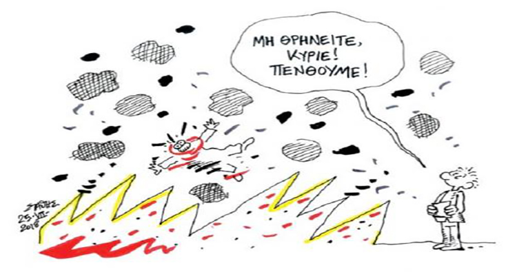 Στο κάτω – κάτω οι νεκροί φταίνε! Αυτοί πνίγηκαν, αυτοί κάηκαν, αυτοί φτώχυναν, εμείς ό,τι μπορούμε κάνουμε για να τους αποκαταστήσουμε τις συντάξεις που τους κόψαμε. Εις αυτής της αποβλάκωσης τον τάφο και σε αυτού του κυνισμού τον λάκκο θάβεται η Ελλάδα. Και το πιο αποτρόπαιο είναι ότι ουδείς διάλογος μπορεί να διεξαχθεί, σωτήριος ή όχι, πάνω απ’ το επίπεδο που θέτει η προπαγάνδα της γλίτσας αυτών που διασύρουν την Αριστερά σε επίπεδο Καρανίκα και δηώνουν την Ελλάδα σε επίπεδο Τρόικας, Πρεσπών και πάσης άλλης «αηδίας του βίου»…