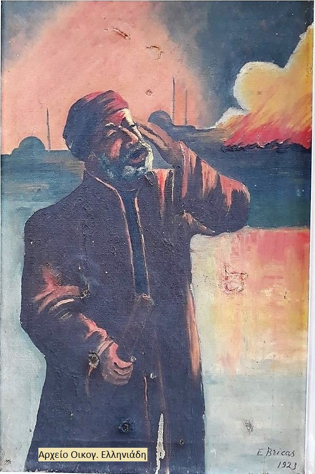 Ο Μπεκτσί Μπαμπάς φωνάζει «Φωτιά!» στην Κωνσταντινούπολη, δια χειρός λαϊκού ζωγράφου, 1923. (αρχείο οικογ. Ελληνιάδη)
