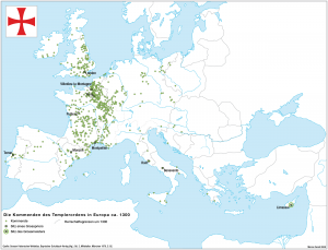 Οι πράσινες κουκίδες δείχνουν τις βάσεις των Ναϊτών Ιπποτών το έτος 1300. Γίνεται φανερό γιατί ο Γάλλος μονάρχης ήταν ο πλέον ανήσυχος.