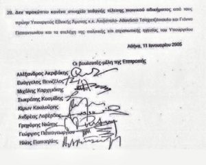 Τα παρακάτω αποσπάσματα είναι από την συνεδρίαση της βουλής, της 25ης Φεβρουαρίου 2005 και δείχνουν την πολύ χαμηλή ποιότητα των εμπλεκομένων πρώην υπουργών, στις υποθέσεις των μιζών, από τα εξοπλιστικά προγράμματα, των υπερασπιστών τους, αλλά και των πασόκων βουλευτών, που εξέδωσαν χωριστό πόρισμα και αθώωσαν τους κατηγορούμενους: