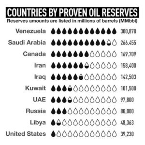 Στο ερώτημα, που έχει να κάνει, με το ποιά είναι η πραγματική γεωπολιτική αξία της Βενεζουέλας, η απάντηση βρίσκεται, μερικώς, στον διπλανό πίνακα. Η αξία της Βενεζουέλας βρίσκεται, στο υπέδαφός της. Στο πετρέλαιο, αφού έχει βρεθεί να είναι η χώρα με τα μεγαλύτερα αποθέματα του “μαύρου χρυσού”, στον κόσμο. Και το πετρέλαιο, παγκοσμίως, εξαντλείται, με αποτέλεσμα, κάπου ανάμεσα, στις δεκαετίες του 2030 και του 2040 να επικρέμαται ο κίνδυνος μιας καταληκτικής οικονομικής κρίσης, ο οποίος μπορεί, μάλιστα, να προκύψει και γρηγορότερα.
