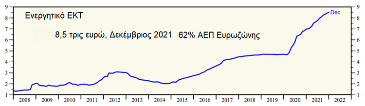 Ωστόσο, η ευρωζώνη είναι ουσιαστικά υπό καθεστώς χρεωκοπίας. Επιβιώνει γιατί χρηματοδοτείται άμεσα από το ενεργητικό της ΕΚΤ, αγοράζοντας τόσο κρατικούς τίτλους χρέους, όσο και εταιρικούς με σχεδόν μηδενικό επιτόκιο. Όπως φαίνεται στο διάγραμμα που παραθέτουμε, το ενεργητικό της ΕΚΤ έφτασε το Δεκέμβριο του 2021 στο πρωτοφανές ύψος των 8,5 τρις ευρώ, ήτοι στο 62% του ΑΕΠ της ευρωζώνης.