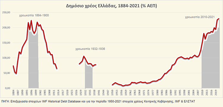 Ας δούμε το διάγραμμα που παραθέτει τα διαθέσιμα στοιχεία δημοσίου χρέους της Ελλάδας ως % του ΑΕΠ στην περίοδο 1884-2021. Όπου λείπουν διαθέσιμα στοιχεία ήταν για την Ελλάδα περίοδοι πολέμων και επαναστάσεων.